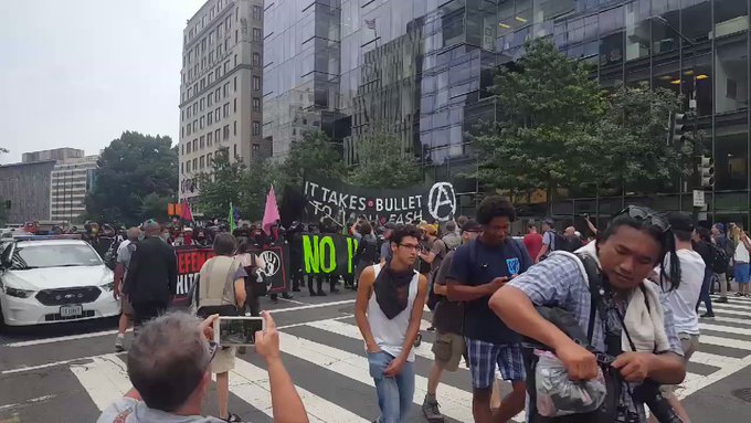 Numerous video clips and photos show Antifa members carrying a large black banner which reads, “It takes a bullet to bash a fash.”